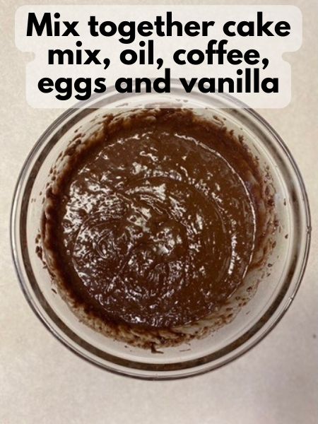 - Mix cake mix, eggs, oil, coffee and vanilla together until smooth.