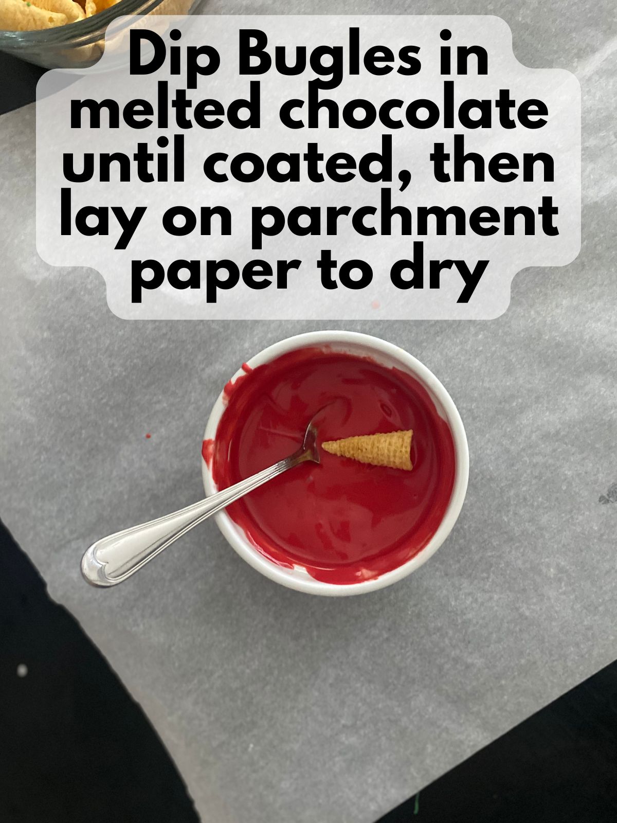 - Hold a Bugle by the wide end and dip it into the melted red or green candy, coating the entire surface. Let the excess drip off, then set it on the parchment paper with the open end facing down (standing up like a hat). Continue until half the Bugles are coated.