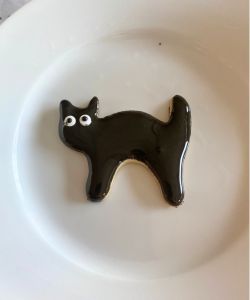Stick the whole cookie face-down in a bowl of black royal icing. Then, carefully pull it out and let excess icing drip off. While the icing is still wet, add candy eyes (if using) and then sprinkle with black glitter (or leave plain!)