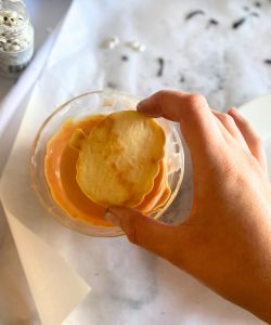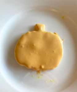Dip the pumpkin face down in the orange royal icing, avoiding the stem if possible. Carefully remove the cookie from the icing and remove excess icing.