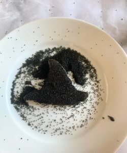 Stick the whole hat face-down in a bowl of black royal icing. Then, carefully pull the hat out and let the excess icing drip off. While the icing is still wet, sprinkle it with black edible glitter. I used sanding sugar that I got at Michael’s.