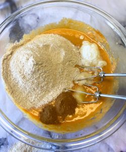 - Add in the whole wheat flour, baking powder, baking soda, salt and pumpkin pie spice.