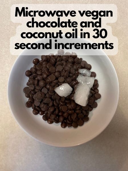 • Put your vegan chocolate in a microwavable bowl and microwave for about 20-30 seconds. Add coconut oil to chocolate and stir.