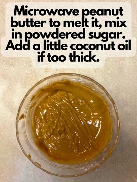 • To make peanut butter drizzle: Melt peanut butter in the microwave for about 20 seconds. Quickly whisk in powdered sugar. If the drizzle seems too thick to "drizzle," add about 1 teaspoon of coconut oil to thin it. Whisk everything until smooth and consistent.