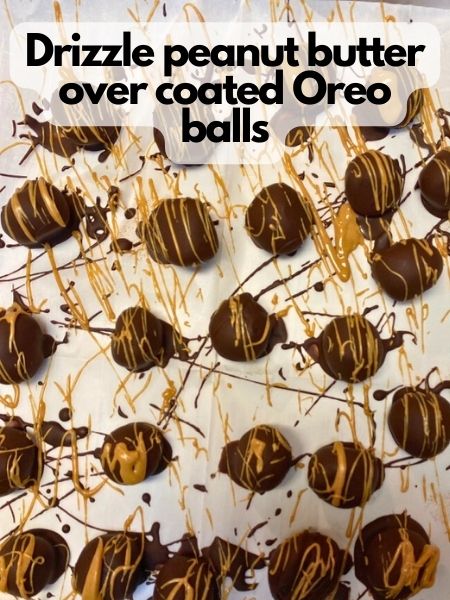 • Drizzle peanut butter drizzle over your coated vegan Oreo balls. You can use a spoon, or put the drizzle in a plastic bag and cut off the corner to drizzle. Let the drizzle set.