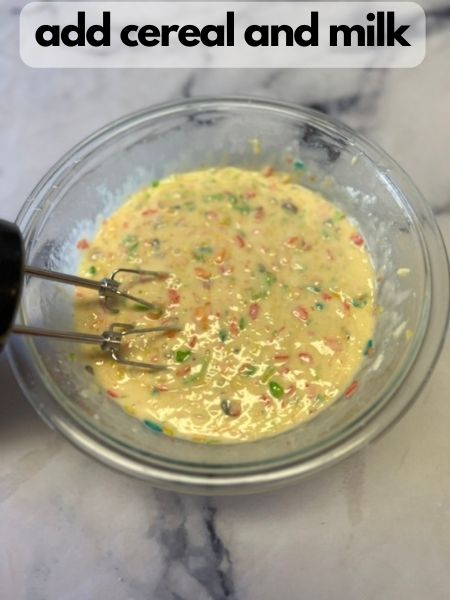 4. Finally, add in your milk and Fruity Pebbles cereal. Mix everything until smooth.