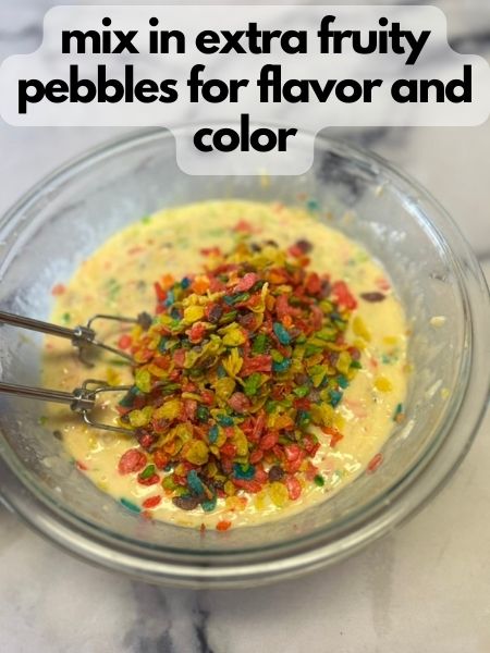 5. Add in the additional cup of Fruity Pebbles cereal and fold into your cake batter.