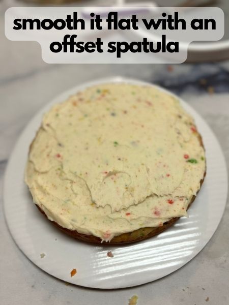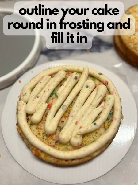- Outline your cake round in frosting, and then fill it in with more frosting. Smooth it flat with an offset spatula.
