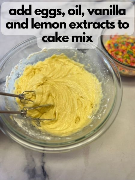 - Put your cake mix, eggs, vanilla and lemon extracts and oil in a bowl and mix until smooth.