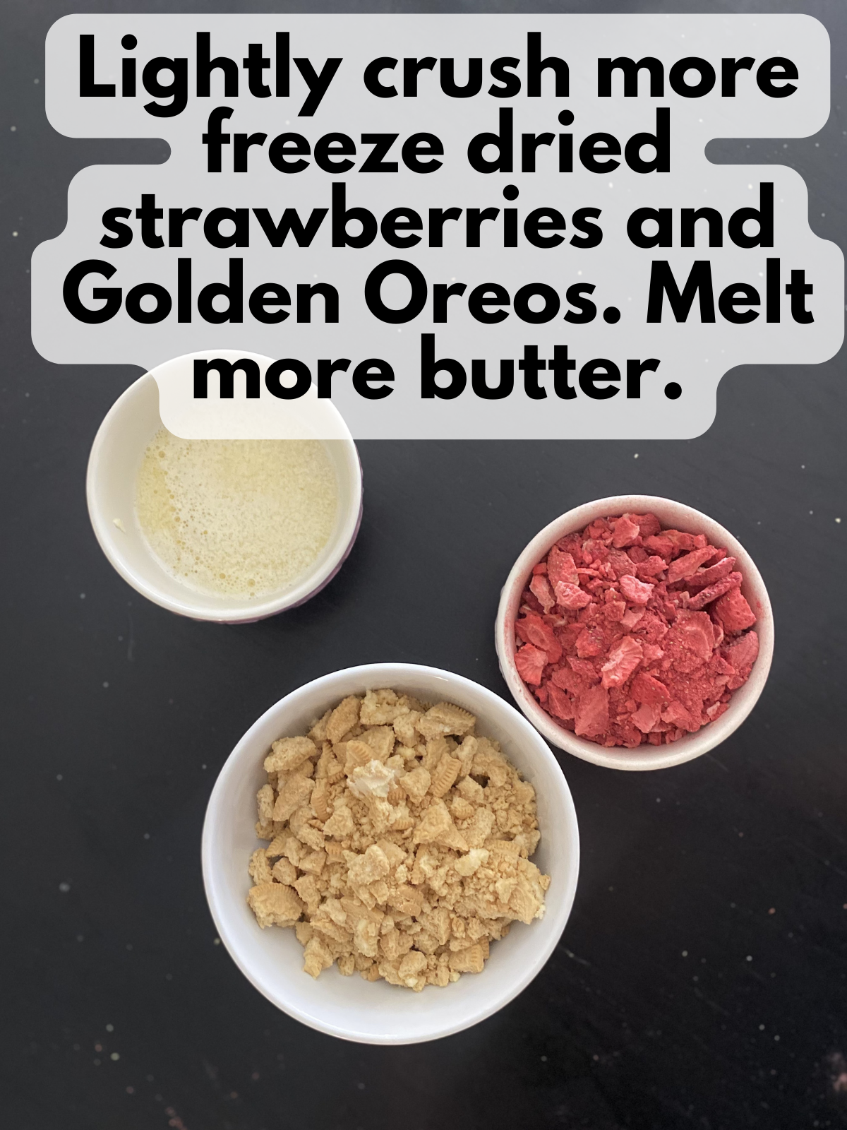 3. In a small mixing bowl, mix together the Golden Oreo Crumbs, crushed freeze dried strawberries and 1/4 cup melted butter.