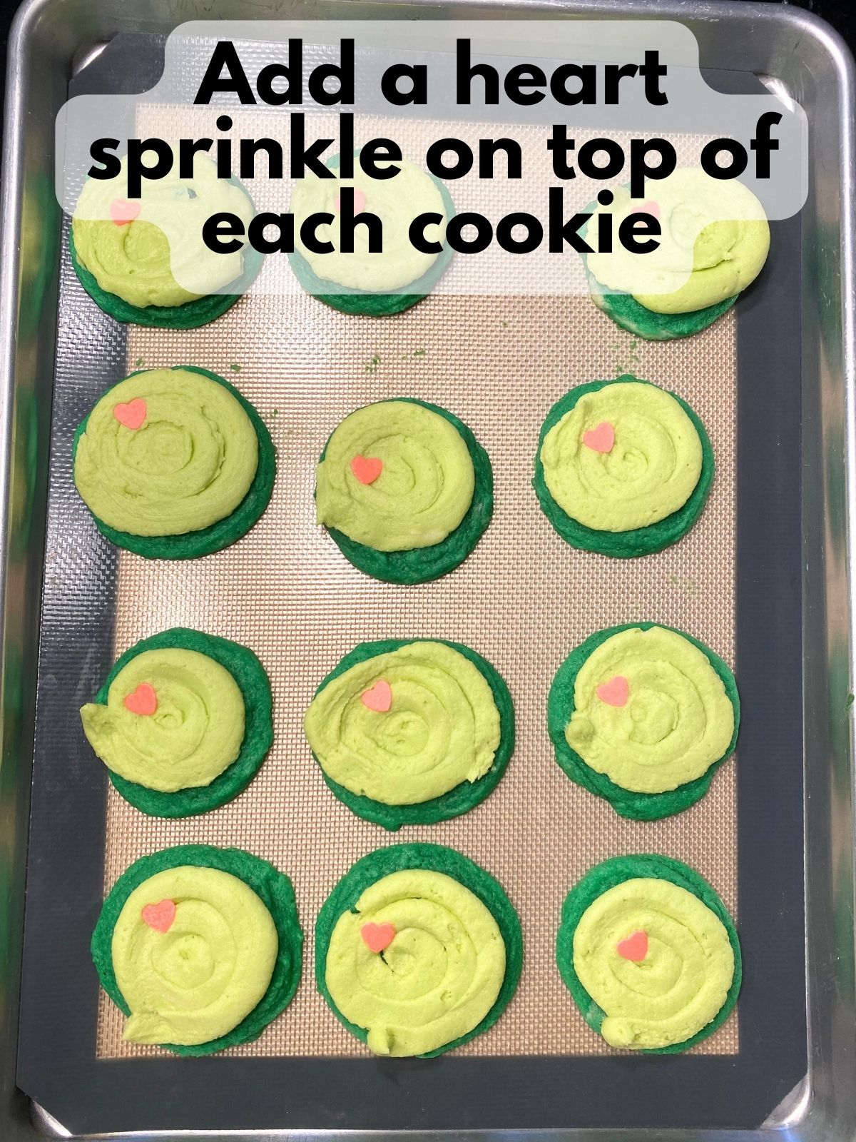 Pipe or spread the frosting generously onto each cookie. Top with a single red heart sprinkle in the corner to complete the Grinch look. These holiday treats are ready to share!