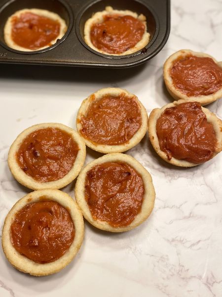 - Fill each crust with filling until the filling is level with the top of the crust. Smooth with the back of a spoon.