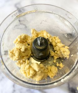 - Add cold water one tablespoon at a time and pulse until the mixture is a doughy consistency.