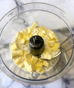 - Put flour, sugar, salt and butter in a food processor. Pulse until mixed together with no large chunks of butter.