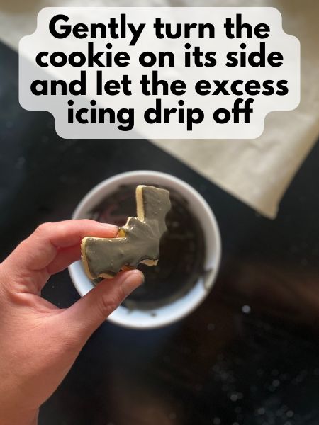 Dip each cookie face-down into the black icing. Lift it out, let the excess drip off, then flip and gently shake or tap to level the surface. Use a toothpick or scribe tool to pop any bubbles. This method is fast and great for batch decorating, though a bit messier.