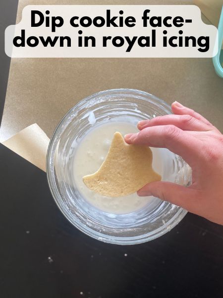 Dip each cookie face-down into the royal icing. Lift it out, let the excess drip off, then flip and gently shake or tap to level the surface. Use a toothpick or scribe tool to pop any bubbles. This method is fast and great for batch decorating, though a bit messier.
