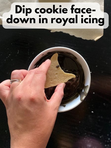 Dip each cookie face-down into the black icing. Lift it out, let the excess drip off, then flip and gently shake or tap to level the surface. Use a toothpick or scribe tool to pop any bubbles. This method is fast and great for batch decorating, though a bit messier.