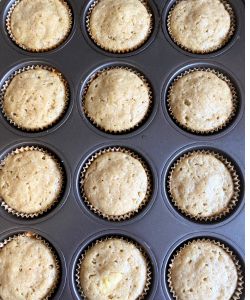 For these banana cupcakes, it is safe to use the “toothpick” method. That is, if you can insert a toothpick and it comes out cleanly, the cupcakes are ready. That is not the case for all types of cupcakes, but it will work for these. Also, please note that there may be little specks of banana or crumbs on your toothpick when it comes out! When I say “it comes out cleanly,” I just mean it doesn’t have obviously still-wet batter on it.