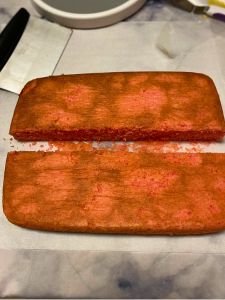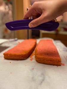 Cut your cake the long way, down the middle. Then, using your cake leveler, carefully cut each of those pieces through the center so that you have 4 long, thin rectangular layers of cake.