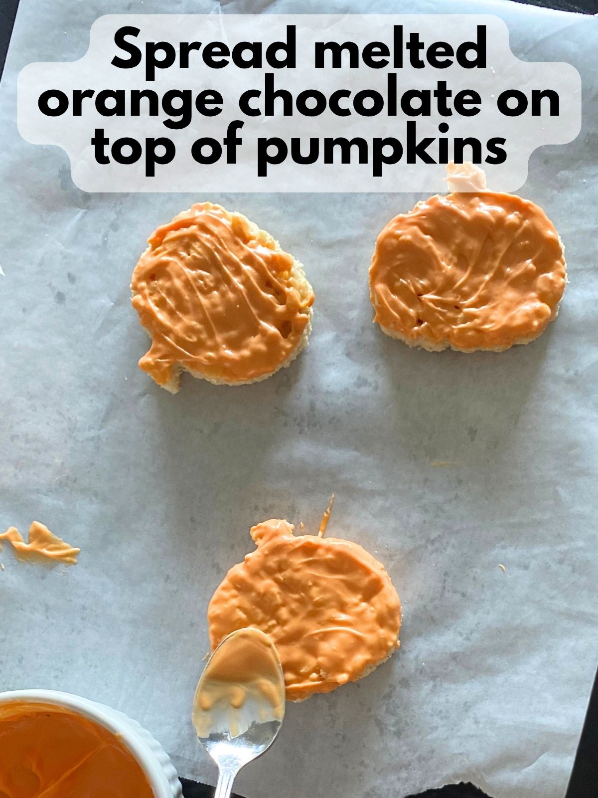 Dip the front of each pumpkin treat into the melted orange chocolate and let the excess drip off. Place on parchment paper to set. Once the coating has set slightly, decorate with black decorating gel, candy eyes, or melted chocolate to make jack-o’-lantern faces.