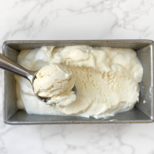 Spread the mixture into a loaf pan or freezer safe container. Smooth the top, then press a piece of parchment paper or plastic wrap directly onto the surface to prevent ice crystals. Freeze for at least 6 hours, or overnight for the best scoopable texture.