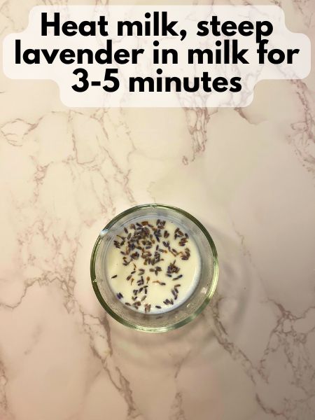 - Heat milk milk in the microwave until it's hot and bubbly. Add lavender to hot milk and let it steep for 3-5 minutes (depending on how strong of a lavender flavor you want)