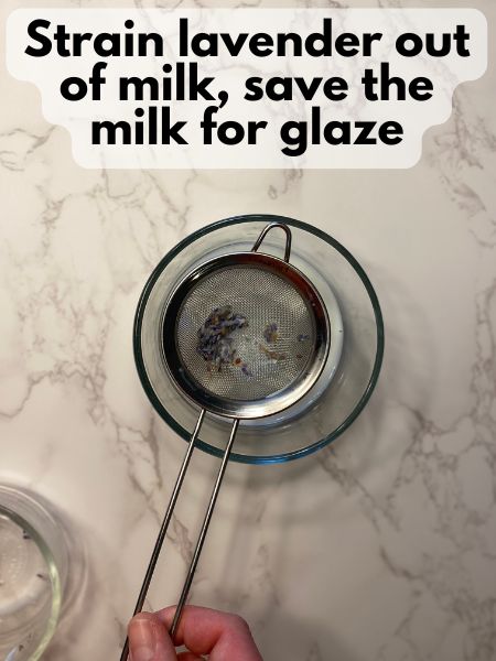 Add lavender-infused milk to powdered sugar slowly and whisk until a glaze forms. You might not use all the milk, but try to use as much as you can to get that yummy lavender flavor.