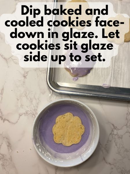 Dip your cooled lemon shortbread cookies face-down in glaze. Set your cookies glazed side up to set.