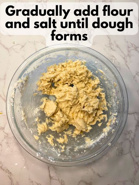 - Gradually add the flour and salt, mixing until a dough forms.