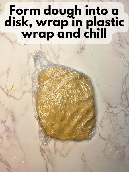 - Shape the dough into a disk, wrap in plastic wrap, and refrigerate for 30 minutes.