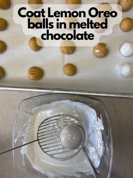 4. Melt your melting candies according to the package instructions. Using a spoon, coat your lemon Oreo balls entirely in chocolate, and then place back on the cookie sheet to set.