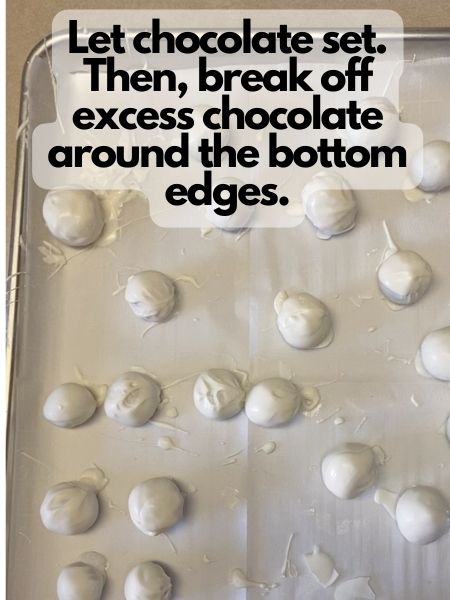 5. Once you coat your Lemon Oreo balls in chocolate and set them down to set, you may see a little puddle of melted chocolate hardening around the base of your Oreo balls. Once the chocolate sets, you can gently break off the excess chocolate with your fingers.