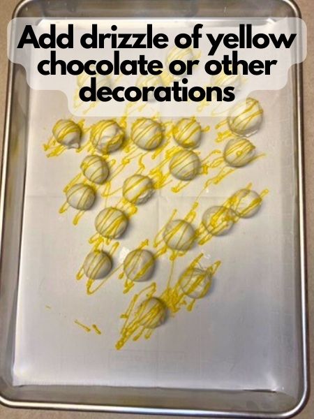 6. If you want to decorate your lemon Oreo balls with something like edible glitter or sprinkles, make sure to do that while the chocolate on the outside is still wet! I chose to do a yellow chocolate drizzle instead, which you can add at the very end even if your white chocolate layer has already set.