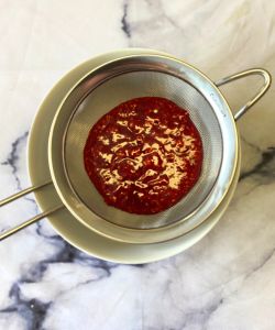 - Place a sieve over a bowl, and pour your raspberry puree into the sieve. Using the back of a spoon, push the mixture through the sieve to remove the raspberry seeds.