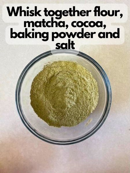 - In a bowl, mix together matcha powder, flour, cocoa powder, baking powder and salt. Set aside.