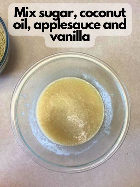 - In a large mixing bow, mix together melted coconut oil and sugar until well combined. Then, add applesauce, coconut milk and vanilla. Mix until well combined.