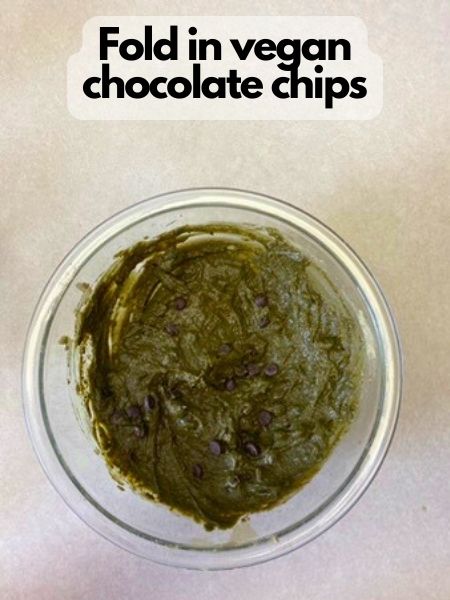 5. Fold in your chocolate chips. This is optional, of course! I used the Tollhouse Plant Based vegan chocolate chips for mine. If you’re having trouble finding vegan chocolate chips, you can easily skip this part.