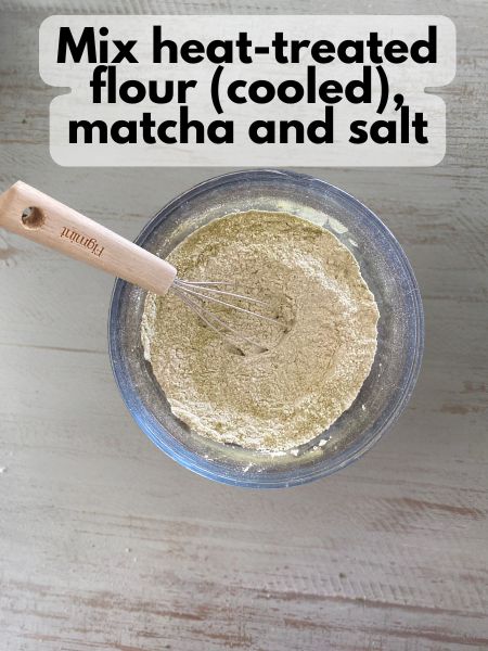 2. Mix the dry ingredients: In a medium bowl, whisk together the heat-treated flour, matcha powder, and salt.