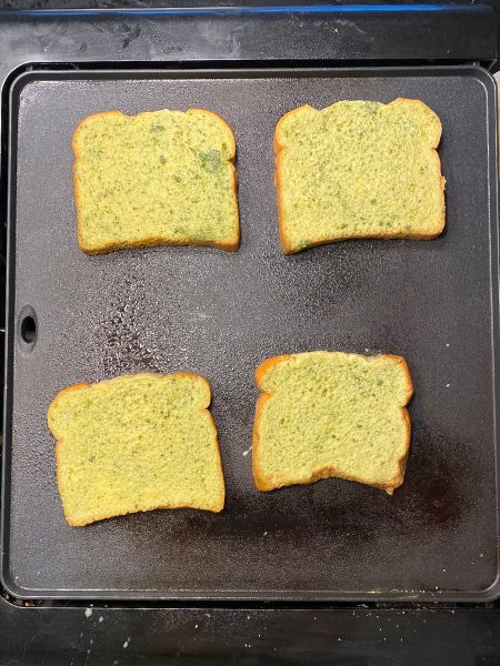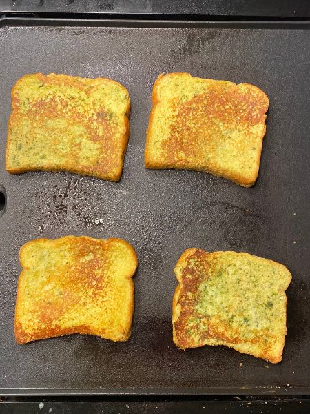 - Heat a non-stick skillet or griddle over medium heat and add a little butter or oil. Once hot, place the soaked bread slices onto the pan. Cook for 2–3 minutes per side, or until golden brown and slightly crispy around the edges.