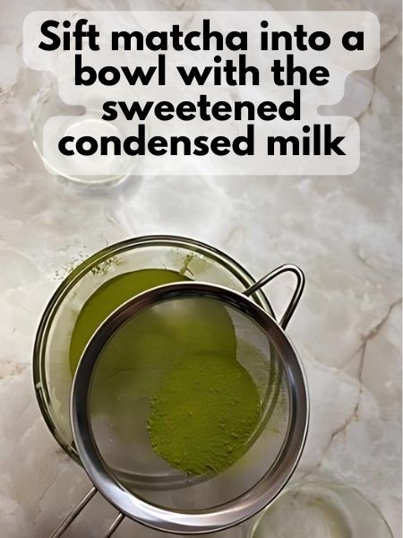 - Pour your sweetened condensed milk into a medium-sized mixing bowl. Sift your matcha powder into that bowl to remove any lumps.