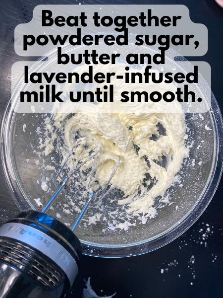 • Beat your butter and powdered sugar, slowly add about half of the lavender-infused milk. Keep beating everything until smooth. Add more lavender-infused milk as necessary for texture.