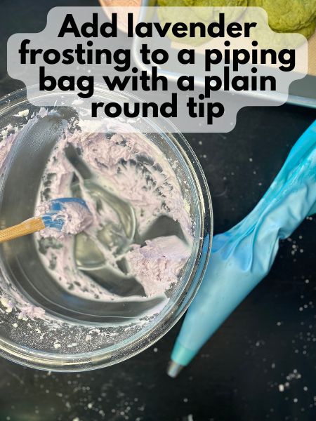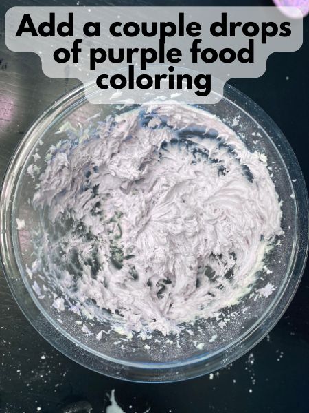 • Add a couple drops of purple food coloring and mix it into your lavender frosting thoroughly.