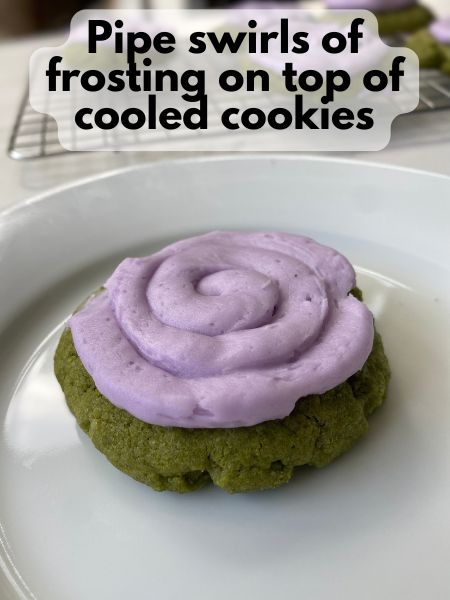 14. Add some lavender frosting to a piping bag with a plain round tip, and add a swirl of frosting to the top of each cookie. Alternatively, you can spread the frosting on with a butter knife.