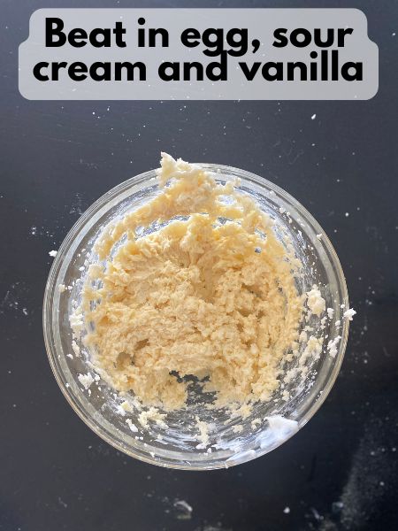 - Add wet ingredients: Beat in the egg, sour cream, and vanilla until smooth.