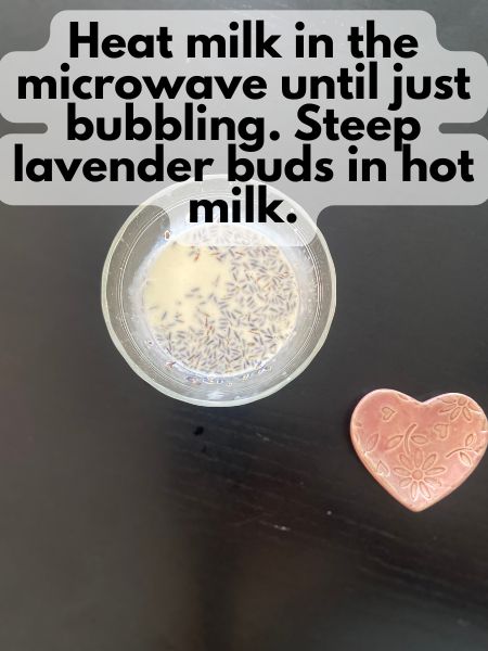 • Then, steep your lavender buds in the hot milk for 4-5 minutes, depending on how strong of a lavender flavor you want. I went with a full 5 minutes, but 4 minutes is good for a lighter flavor.