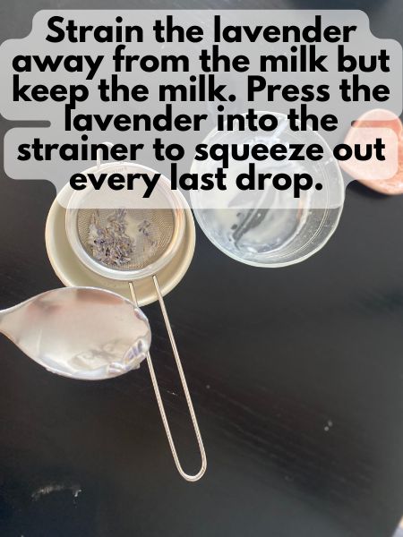 • Use a small strainer to strain the lavender buds away from the milk, but keep the milk. I like to use the back of a spoon to press the lavender buds into the strainer to squeeze out every last drop of lavender flavor.