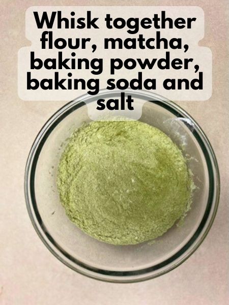 - In a medium-sized bowl, whisk together the flour, matcha powder, baking powder, baking soda, and salt. Set aside.