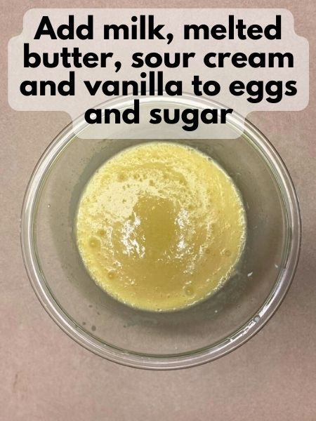 - In a separate large bowl, whisk together the sugar and eggs until well combined and slightly frothy. Add the sour cream, milk, melted butter, and vanilla extract. Mix until smooth.