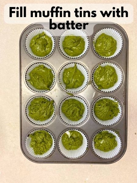 - Spoon the batter into the prepared muffin tin, filling each cup about 2/3 full.