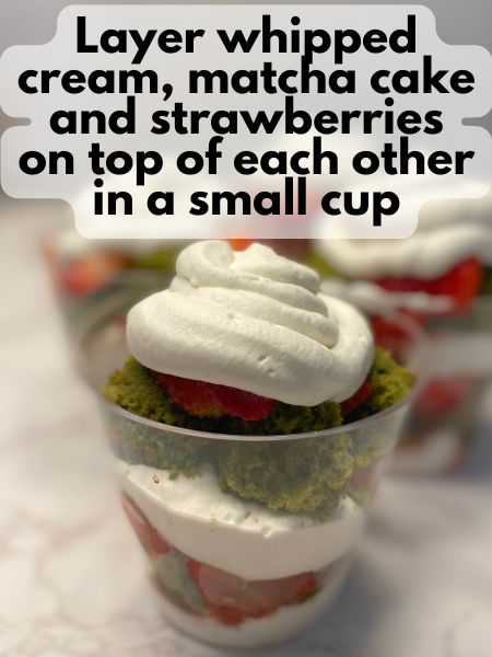 - In small dessert cups or glass jars, layer the components: -The bottom and top layers should be whipped cream-In between the whipped cream, layer matcha cake on the bottom and strawberries (with their juices) on top of the cake.So, something like: whipped cream (on bottom), matcha cake, strawberries, whipped cream, matcha cake, strawberries, whipped cream. If you don't have room in your cups for two sets of layers, 1 is fine.